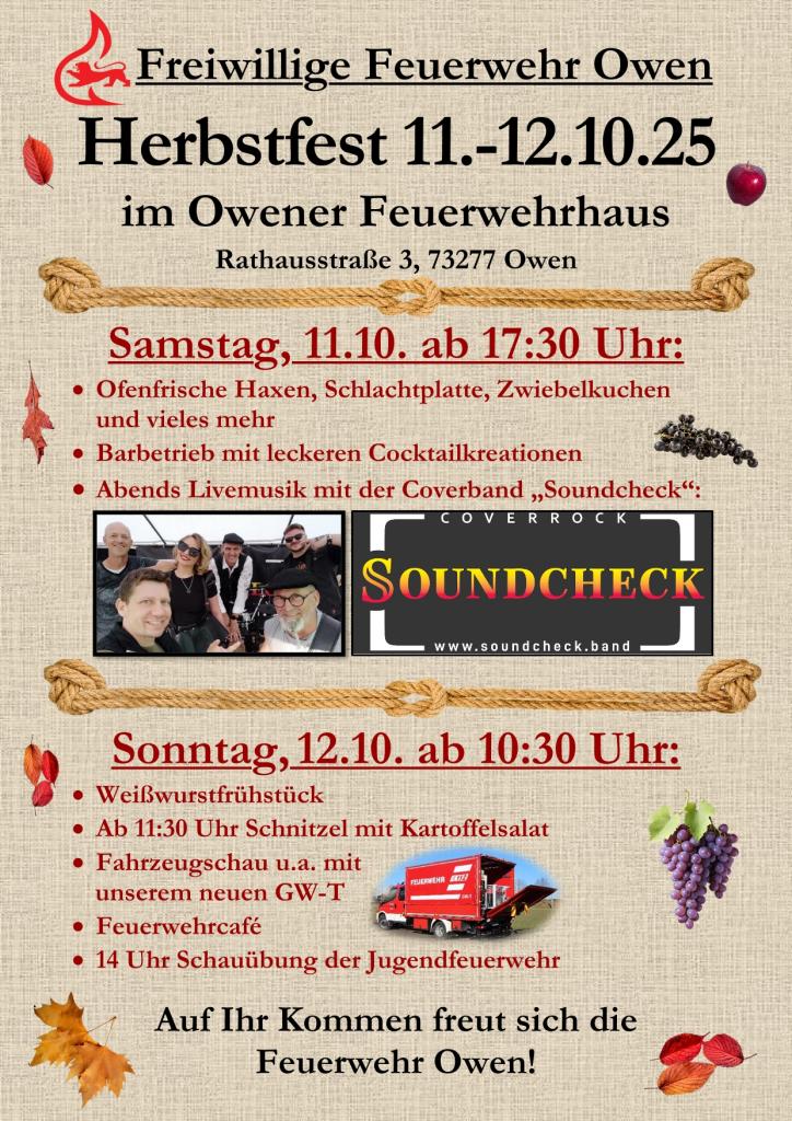 Der Herbst ist da und damit ist es wieder soweit: die Feuerwehr Owen veranstaltet am 11. und 12.10. ihr Herbstfest im Owener Feuerwehrmagazin.
