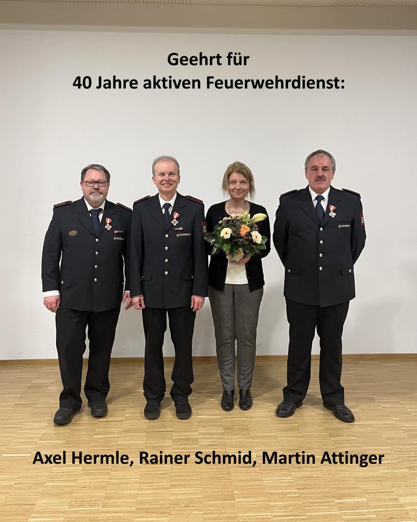 Für 15 Jahre aktiven Feuerwehrdienst wurden Johannes Grötzinger, Heiko Häußler, Fabian Schmid, Michael Tischer, Sebastian Löw und in Abwesenheit Moritz Raichle geehrt, die Ehrung für 40 Jahre aktiven Feuerwehrdienst erhielten Axel Hermle, Rainer Schmid und Martin Attinger und für 60 Jahre Zugehörigkeit zur Feuerwehr wurde Ernst Kerner ausgezeichnet.