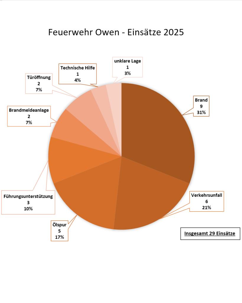 Die Feuerwehr Owen wurde 2025 zu insgesamt 29 Einsätzen alarmiert, diese gliedern sich folgendermaßen: