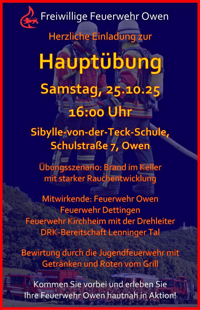 Herzliche Einladung zur Hauptübung der Feuerwehr Owen am Samstag, 25.10.25 um 16 Uhr an der Sibylle-von-der-Teck-Schule in Owen, Schulstraße 7!