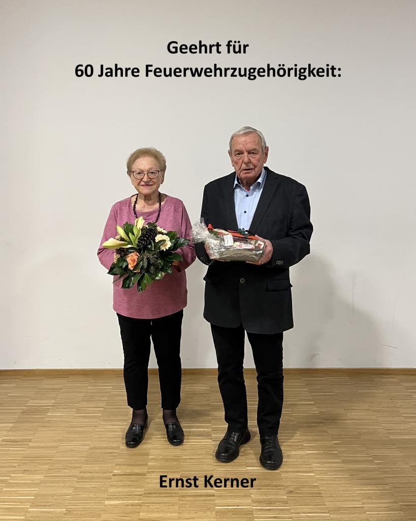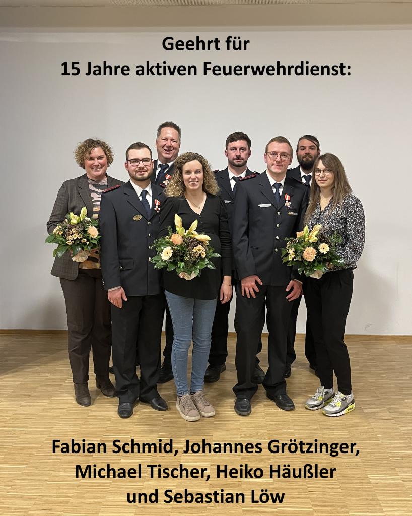 Für 15 Jahre aktiven Feuerwehrdienst wurden Johannes Grötzinger, Heiko Häußler, Fabian Schmid, Michael Tischer, Sebastian Löw und in Abwesenheit Moritz Raichle geehrt, die Ehrung für 40 Jahre aktiven Feuerwehrdienst erhielten Axel Hermle, Rainer Schmid und Martin Attinger und für 60 Jahre Zugehörigkeit zur Feuerwehr wurde Ernst Kerner ausgezeichnet.
