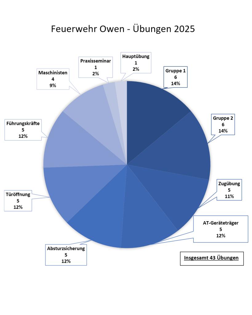 Insgesamt wurden 2025 bei der Feuerwehr Owen 43 Übungen durchgeführt (ohne Jugendfeuerwehr):